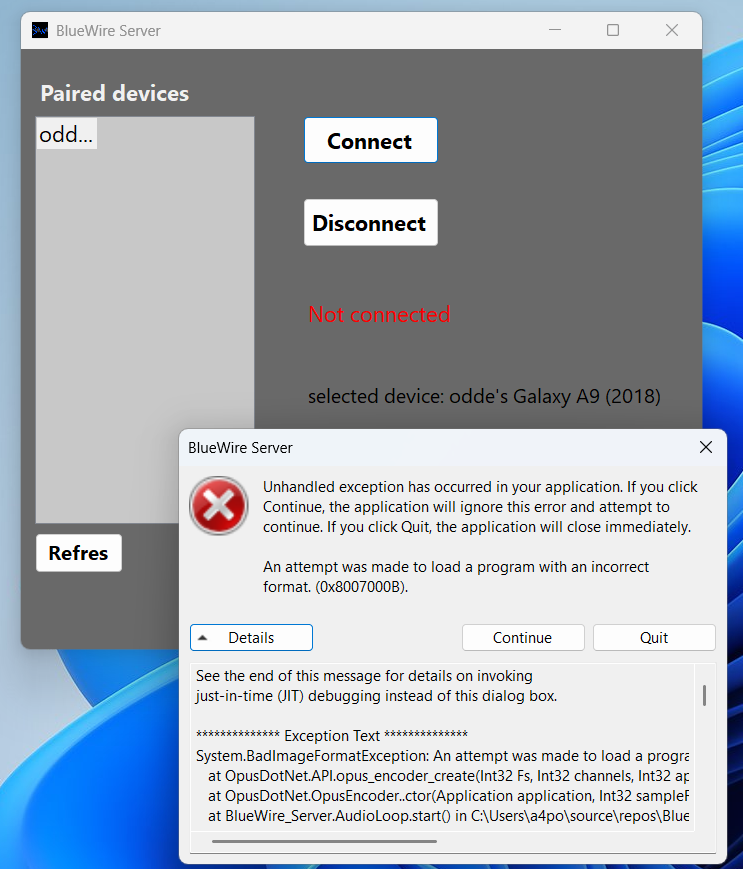 Maybe try removing the "win-x86" folder found in "BlueWire Server\runtimes" and see what happens.